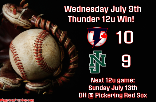 Thunder 12u win in Northumberland 10-9 over the Jacks. Kingston Thunder 12U built a 6-run lead in the second inning and then held off Northumberland Jacks 12U's charge for a 10-9 victory on Wednesday. Kingston Thunder 12U flipped the game on its head in the top of the second, scoring seven runs on three hits to take the lead, 7-1. The biggest blow in the inning was a double by Owen D on a full count that drove in two. A walk by Owen extended the Kingston Thunder 12U lead to 8-4 in the top of the third inning. Noah I started on the mound for Kingston Thunder 12U. The starter allowed six hits and five runs (two earned) over three and two-thirds innings, striking out nine and walking three. Willem P started on the hill for Northumberland Jacks 12U. The hurler allowed three hits and seven runs over one and one-third innings, striking out two and walking five. George H and Doyle B each appeared in relief for Kingston Thunder 12U. Owen and George each collected two hits for Kingston Thunder 12U. Bronx M and Owen each drove in two runs for Kingston Thunder 12U. Kingston Thunder 12U had patience at the plate, collecting eight walks for the game. Grady L and Jake D led the team with two walks each. Next up for Kingston Thunder 12U is a doubleheader at Pickering Red Sox 12U on Sunday. Go to - > 12u Rep Team Page