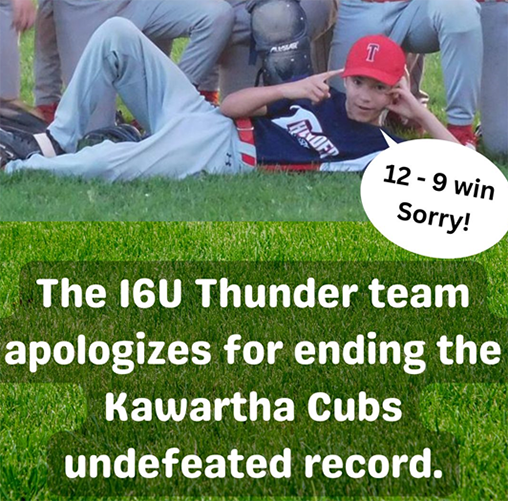 On Sunday July 6th Thunder 16u defeated the Kawartha Cubs 12-9 ending their 11 game undefeated streak. The win puts Thunder at 11-2 in second place behind the Cubs in the EOBA 16u division.
